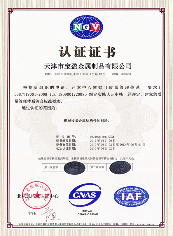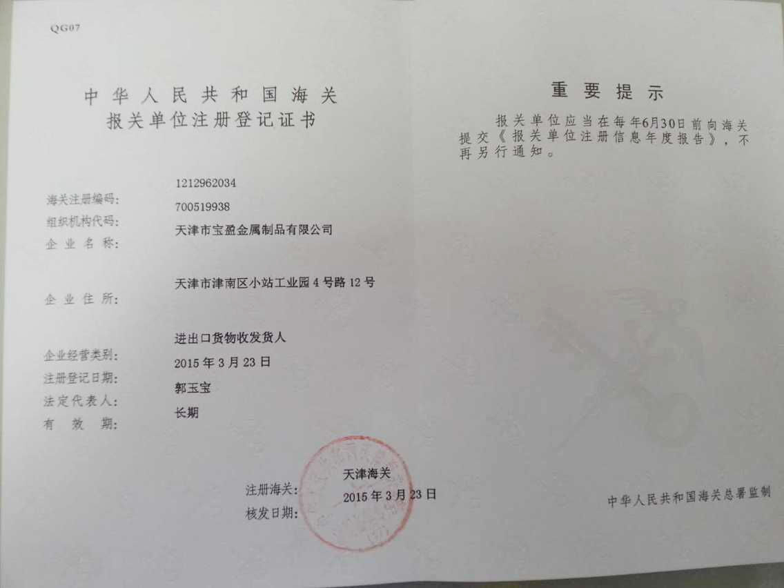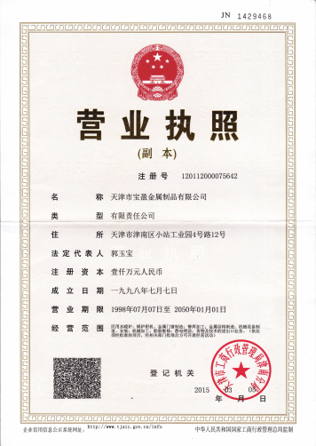天津市寶盈金屬制品有限公司成立于1998年,公司坐落于天津市津南區小站工業園。距津港高速公路2公里,塘沽港25公里,天津濱海國際機場25公里,海、陸、空交通十分便利。公司占地面積10000平方米,年生產能力4500噸金屬制品,包括辦公室人員及車間工人寶盈共有100多名員工。 2010年6月2日,通過了ISO9001:2008質量管理體系認證,2012年5月由摩迪國際進行焊工考試,取得EN 287-1焊工資格證書。